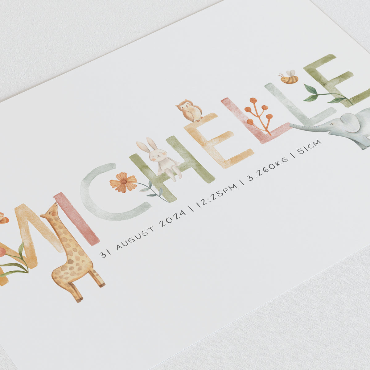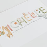 Make your little one's space extra special with our Animal Name Print! Pick your favorite forest friends to surround your little one's name. Add birth details for an extra sprinkle of magic! It's the purr-fect gift for new arrivals that brings woodland whimsy to any nursery wall. Ready to make memories that are wild and wonderful!