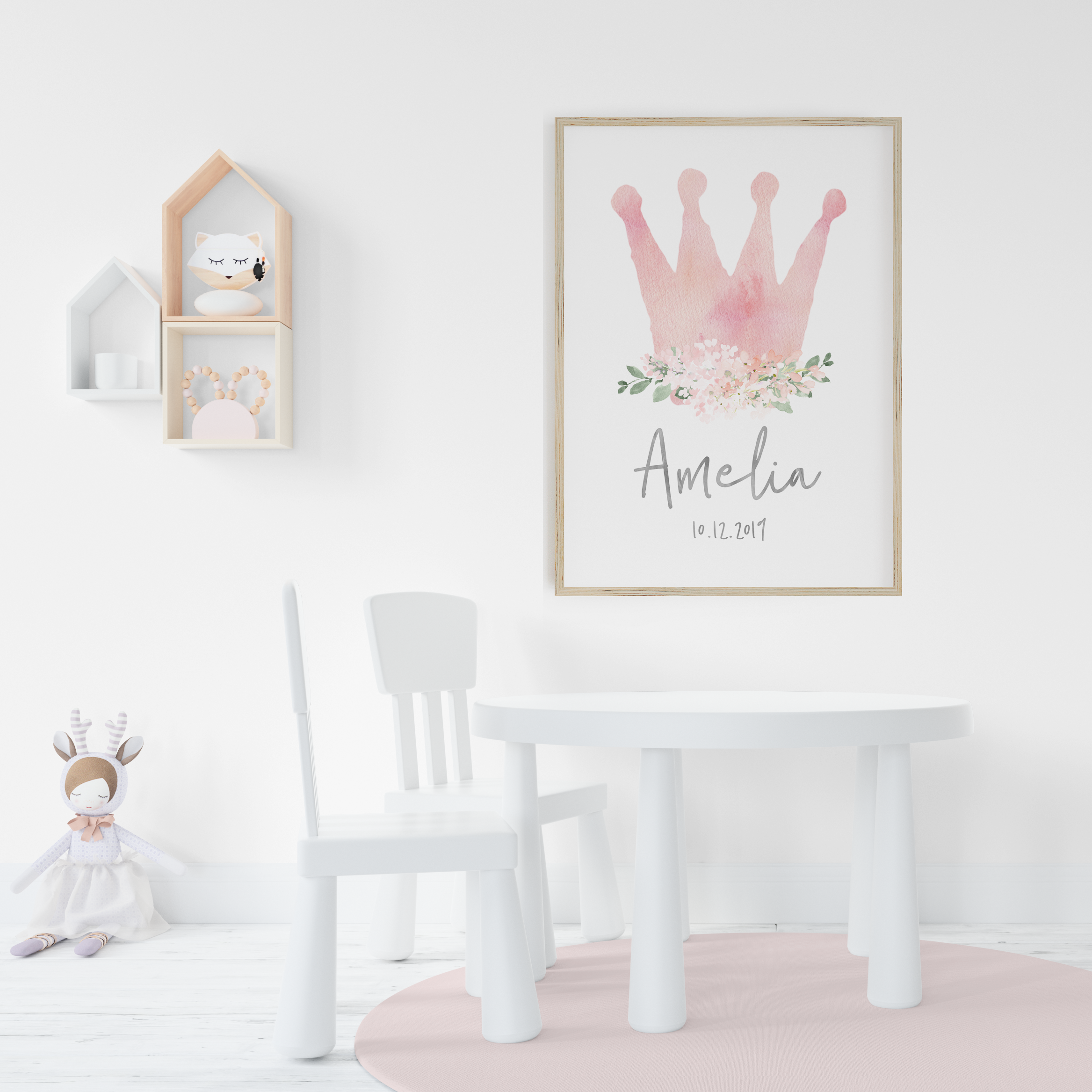 A pink watercolour crown wall art print personalised with your child's name and birth date.