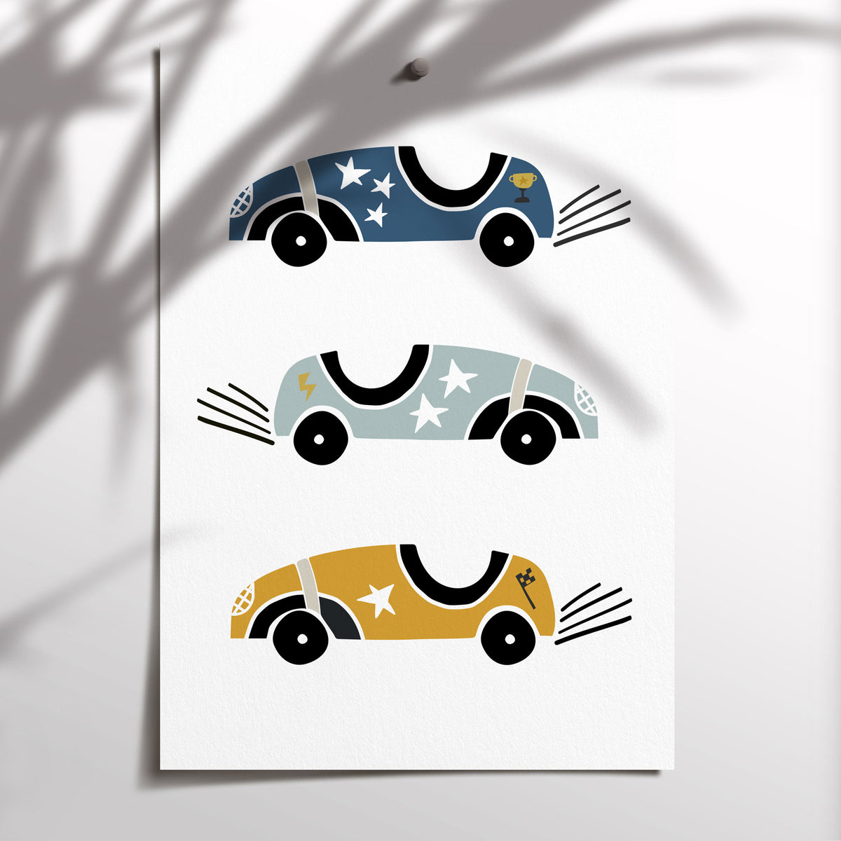 A set of three prints featuring vintage racing cars, a black name & initial & alphabet print. A perfect new baby boy gift, or a great way to add the finishing touches to your own child's nursery, playroom or bedroom space.