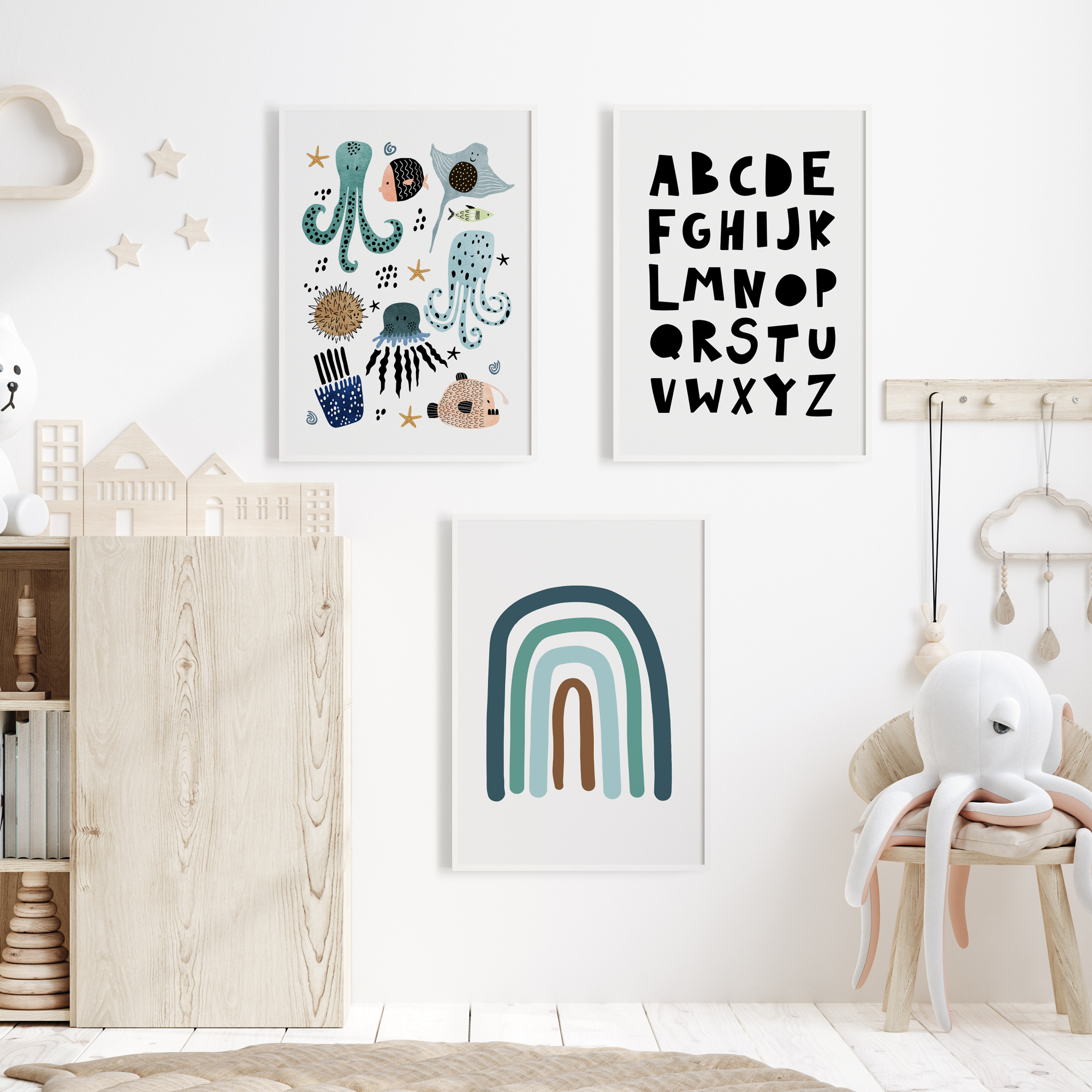 This set of three nursery prints features distinct, high-quality illustrations of Australia's iconic native animals: koala, wombat, and kangaroo. This ready-to-hang wall art is perfect for adorning your child's nursery. The vibrant colors, detailed depictions and premium materials ensure a lifetime of enjoyment.