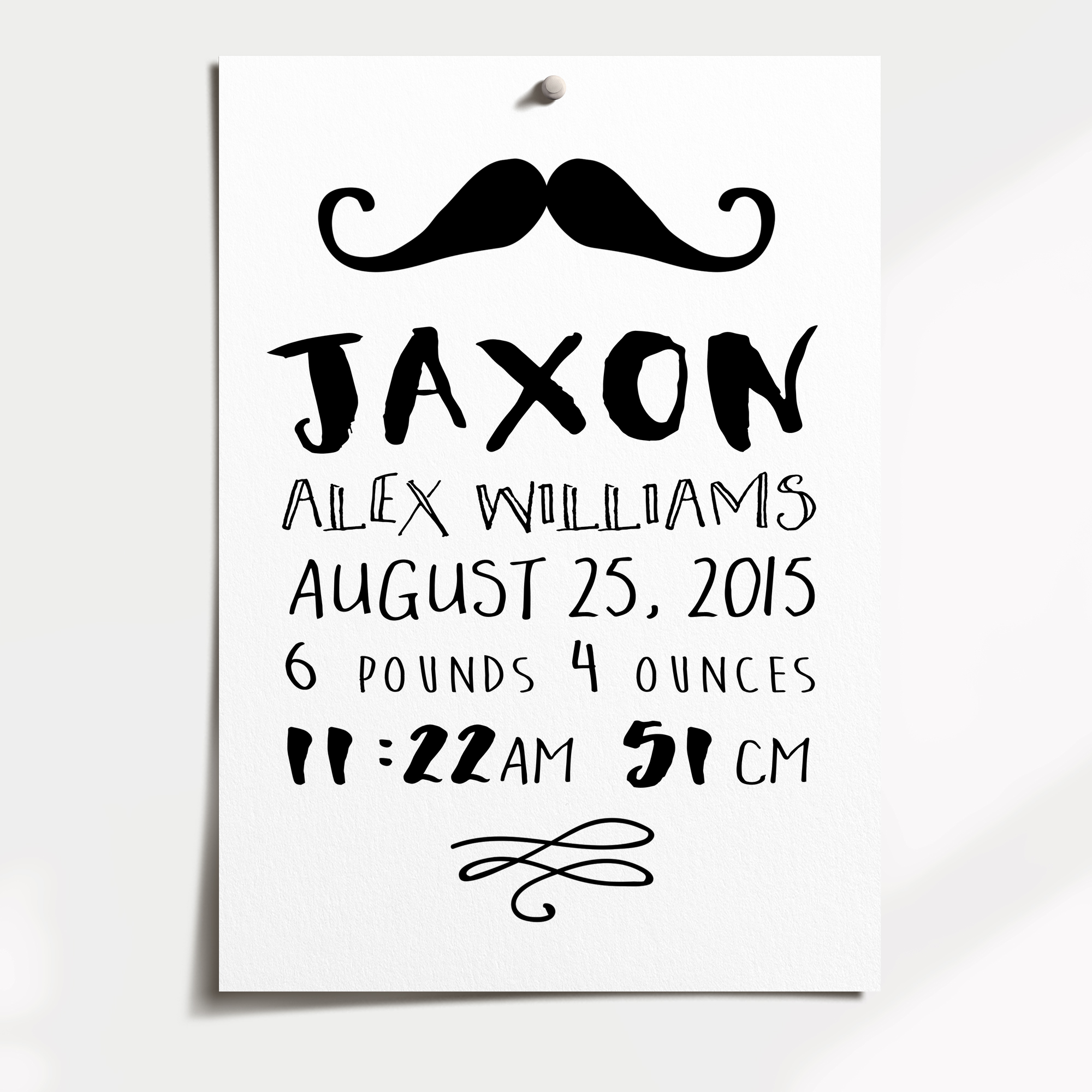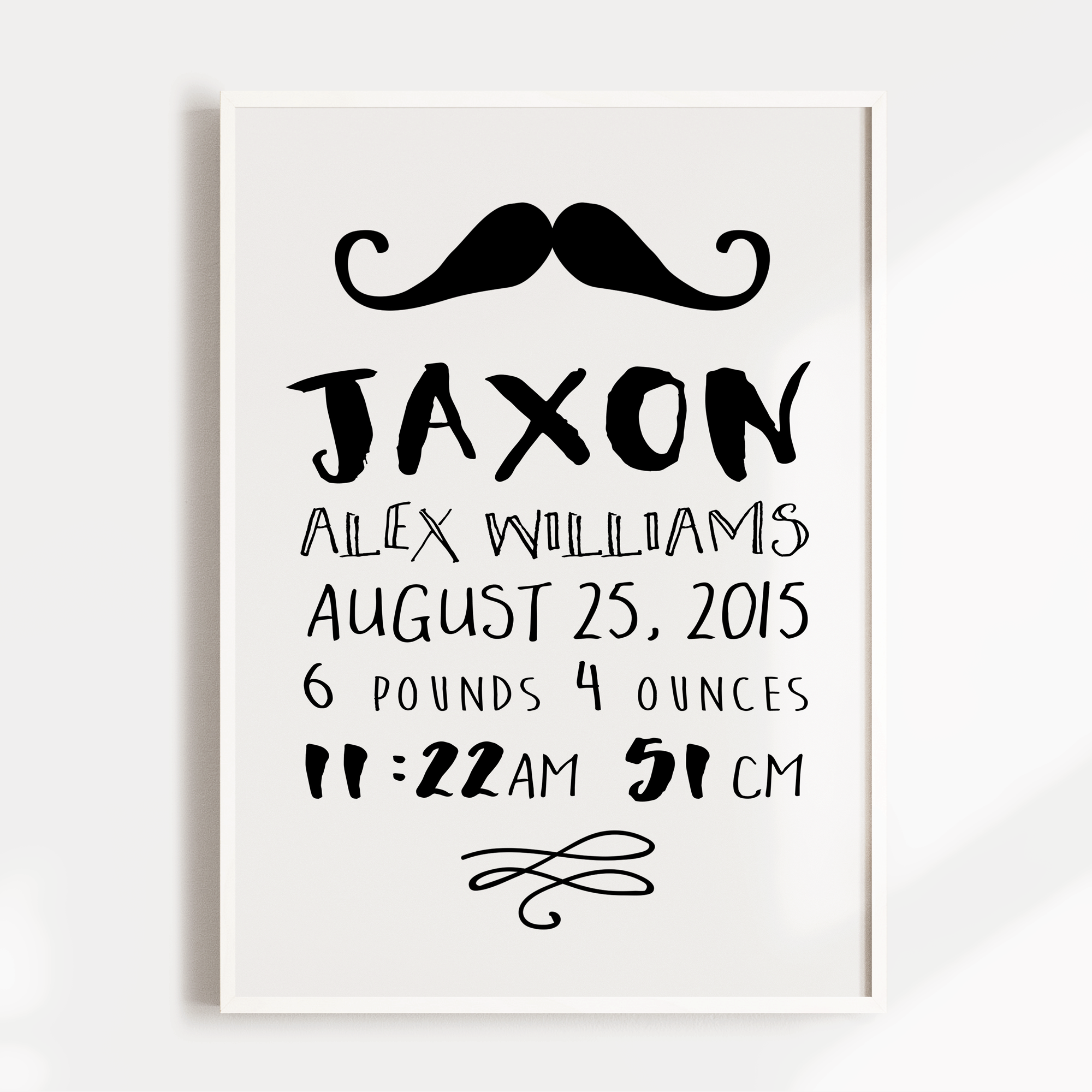 Perfect for the hipster nursery is our moustache birth details print, personalised with your child's details. A perfect new baby gift or add the finishing touches to your own little ones space.