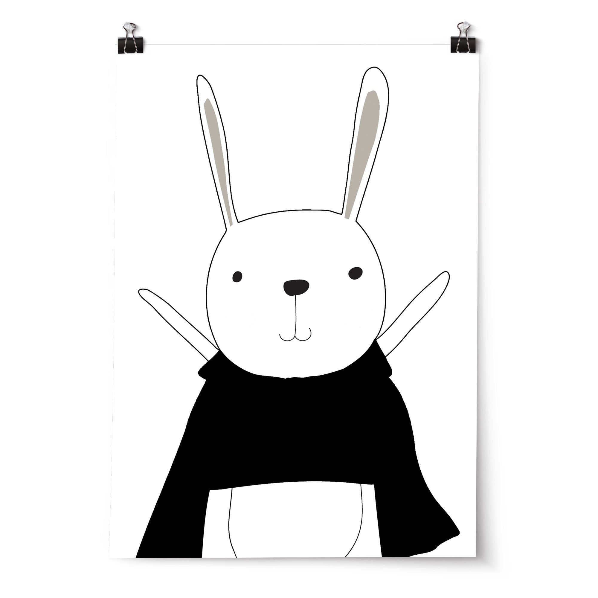 A monochrome Superhero Bunny wall art print perfect for the superhero, scandi or monochrome nursery, bedroom or playroom.