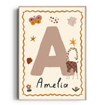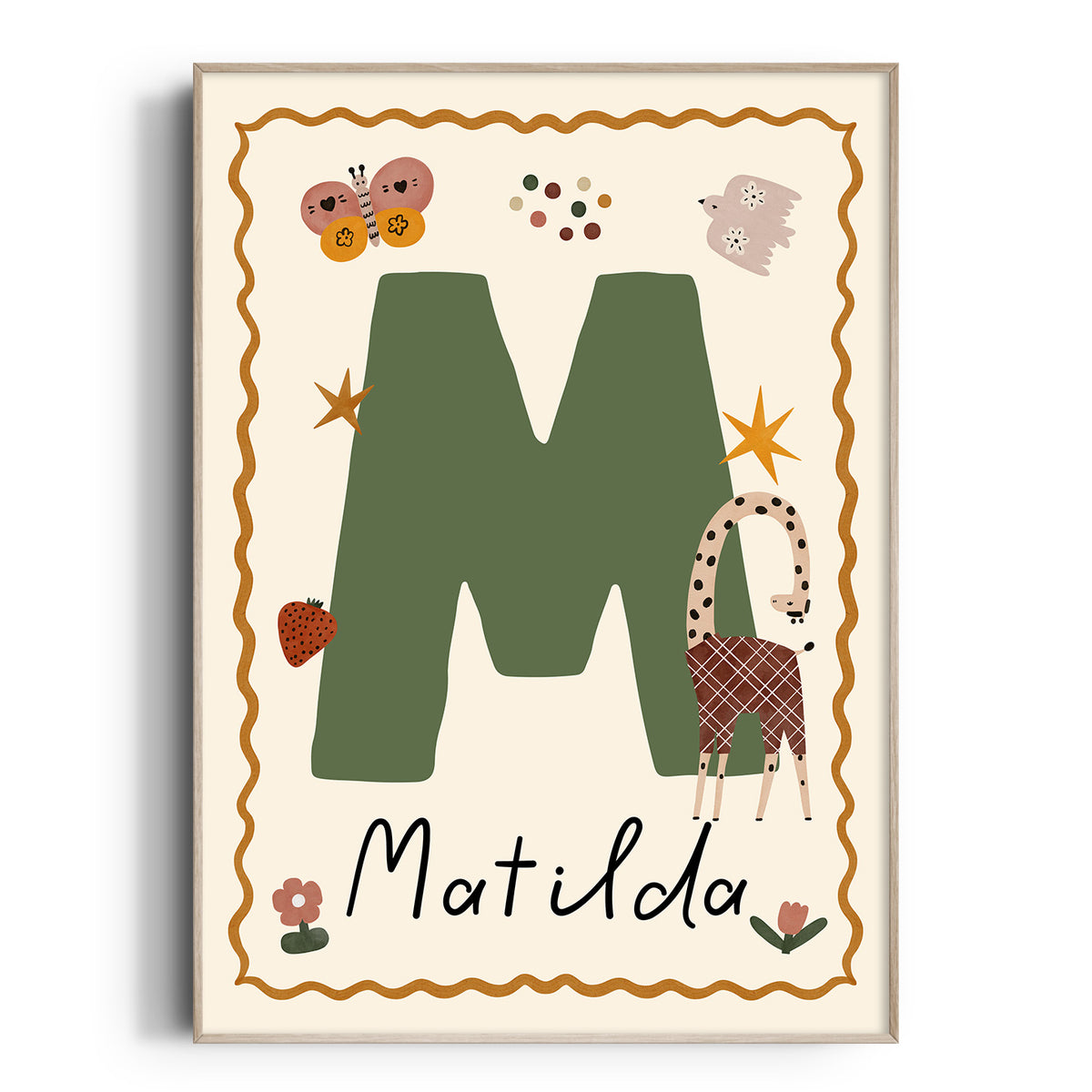 Bring charm and sweetness to your little one’s space with this personalised nursery print, featuring your choice of letter and surrounded by whimsical details — a friendly giraffe, a smiling butterfly, golden stars, and soft floral accents.